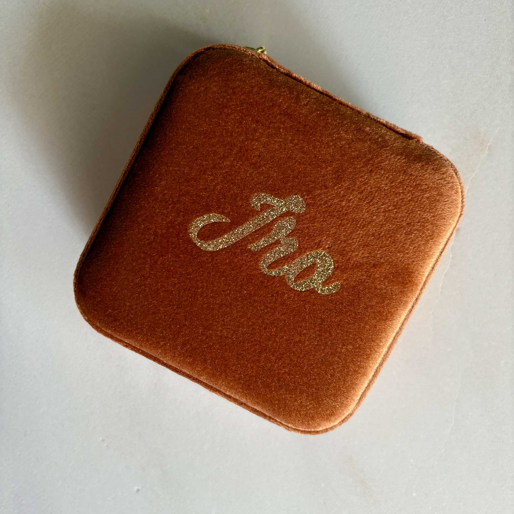 Βελούδινη κοσμηματοθήκη σε χρώμα χάλκινο/μπρονζέ, ιδανική για ταξίδια αλλά και για αποθήκευση των αγαπημένων σας κοσμημάτων. Υλικά και κατασκευή εξαιρετικής ποιότητας. Με 2 επίπεδα αποθήκευσης στο εσωτερικό, από καστόρ, με εσωτερικό καθρέπτη και χρυσό φερμουάρ. Επιδέχεται προσωποποίησης με τύπωμα του ονόματος που επιθυμείτε στην εξωτερική άνω επιφάνεια (υπηρεσία με έξτρα χρέωση).