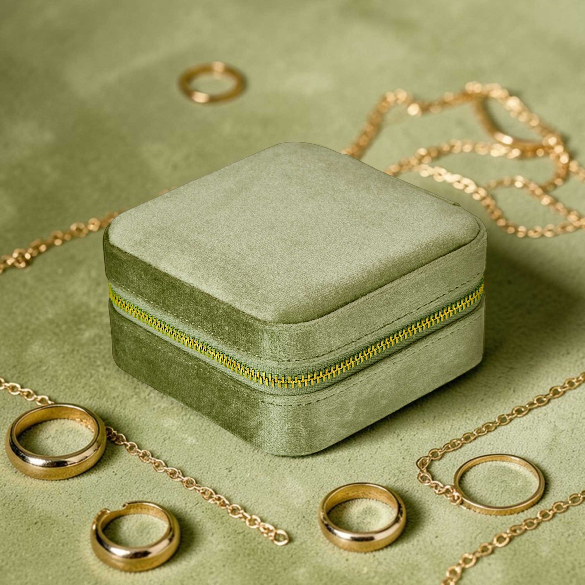 Βελούδινη κοσμηματοθήκη στο χρώμα της χρυσελιάς, ιδανική για ταξίδια αλλά και για αποθήκευση των αγαπημένων σας κοσμημάτων. Υλικά και κατασκευή εξαιρετικής ποιότητας. Με 2 επίπεδα αποθήκευσης στο εσωτερικό, από καστόρ, με εσωτερικό καθρέπτη και χρυσό φερμουάρ. Επιδέχεται προσωποποίησης με τύπωμα του ονόματος που επιθυμείτε στην εξωτερική άνω επιφάνεια (υπηρεσία με έξτρα χρέωση).