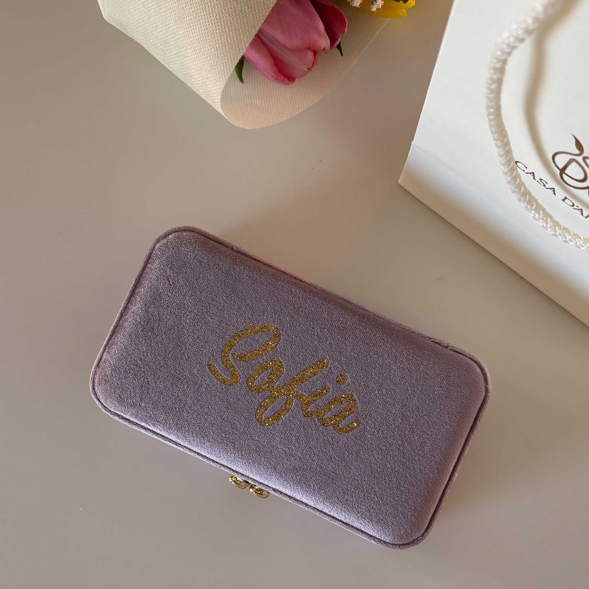 Βελούδινη κοσμηματοθήκη σε χρώμα μεταλλικό λιλά, ιδανική για ταξίδια αλλά και για αποθήκευση των αγαπημένων σας κοσμημάτων. Υλικά και κατασκευή εξαιρετικής ποιότητας. Με εσωτερικό από σουέντ και βελούδο, καθρέπτη και χρυσό διπλό φερμουάρ. Επιδέχεται προσωποποίηση με τύπωμα του ονόματος που επιθυμείτε στην εξωτερική άνω επιφάνεια (υπηρεσία με έξτρα χρέωση).