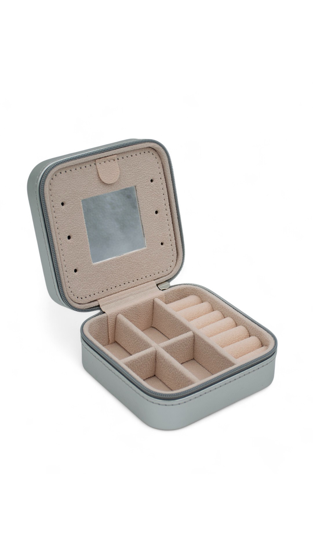 Ασημί κοσμηματοθήκη από δερματίνη, διαστάσεων 10x10x5εκ., ιδανική για ταξίδια αλλά και για αποθήκευση των αγαπημένων σας κοσμημάτων. Υλικά και κατασκευή εξαιρετικής ποιότητας. Με 2 επίπεδα αποθήκευσης στο εσωτερικό, από καστόρ, με εσωτερικό καθρέπτη και ασημί φερμουάρ. Επιδέχεται προσωποποίησης με τύπωμα του ονόματος που επιθυμείτε στην εξωτερική άνω επιφάνεια (υπηρεσία με έξτρα χρέωση).