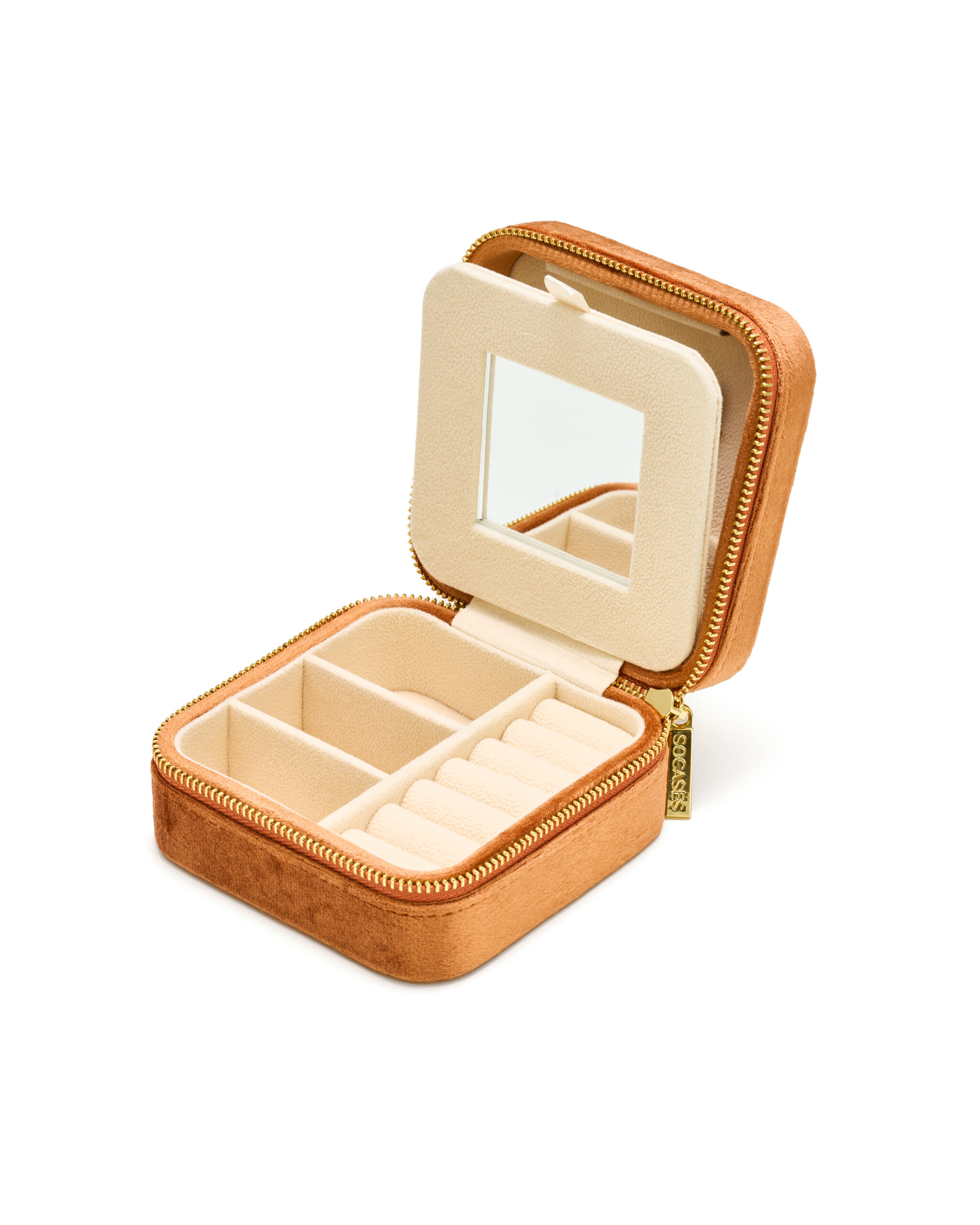 Βελούδινη κοσμηματοθήκη χρώματος ματζέντα, ιδανική για ταξίδια αλλά και για αποθήκευση των αγαπημένων σας κοσμημάτων. Υλικά και κατασκευή εξαιρετικής ποιότητας. Με 2 επίπεδα αποθήκευσης στο εσωτερικό, από βελούδο, με εσωτερικό καθρέπτη και χρυσό φερμουάρ. Επιδέχεται προσωποποίησης με τύπωμα του ονόματος που επιθυμείτε στην εξωτερική άνω επιφάνεια (υπηρεσία με έξτρα χρέωση).